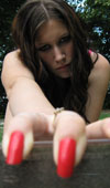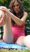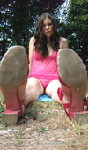Ana, bellissima modella dei paesi dell'est, in questo shooting realizzato in un parco sui colli bolognesi, indossa intimo coulotte, autoreggenti e collant nere, babydoll e mutandine in pizzo trasparente rosa, Bellissimi glutei e primi piani in stile upskirt che mostrano le parti intime dal basso verso l'alto. Piante dei Piedi belle e sinuose. Primi piani piedi in collant calzanti sandali e decollette nere. Bellissime mani con smalto rosso.